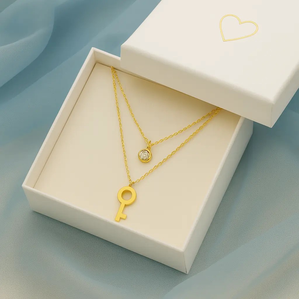 Ce collier clé pour femme associe deux chaînes délicates : l’une ornée d’un pendentif clé minimaliste, l’autre sublimée par un oxyde de zirconium blanc qui capte subtilement la lumière.